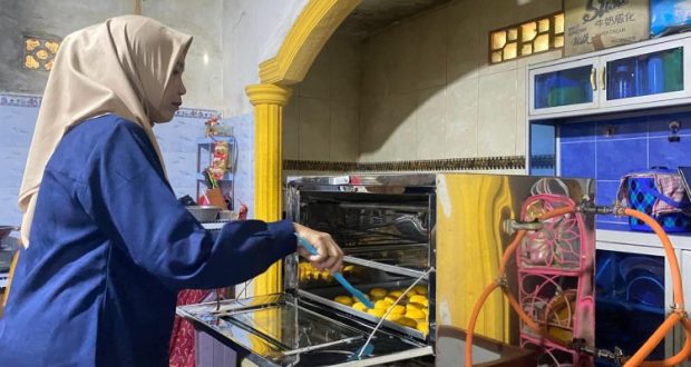 BINTAN – Di dapur rumah sederhana, seorang perempuan berhijab tampak berdiri di depan oven besar berbahan logam. Tangannya memegang spatula, matanya fokus memperhatikan deretan adonan berwarna kuning keemasan yang mulai mengembang. Cahaya lampu dapur memantul di permukaan oven, menciptakan suasana hangat yang menegaskan bahwa proses ini bukan sekadar memasak, melainkan merawat harapan.